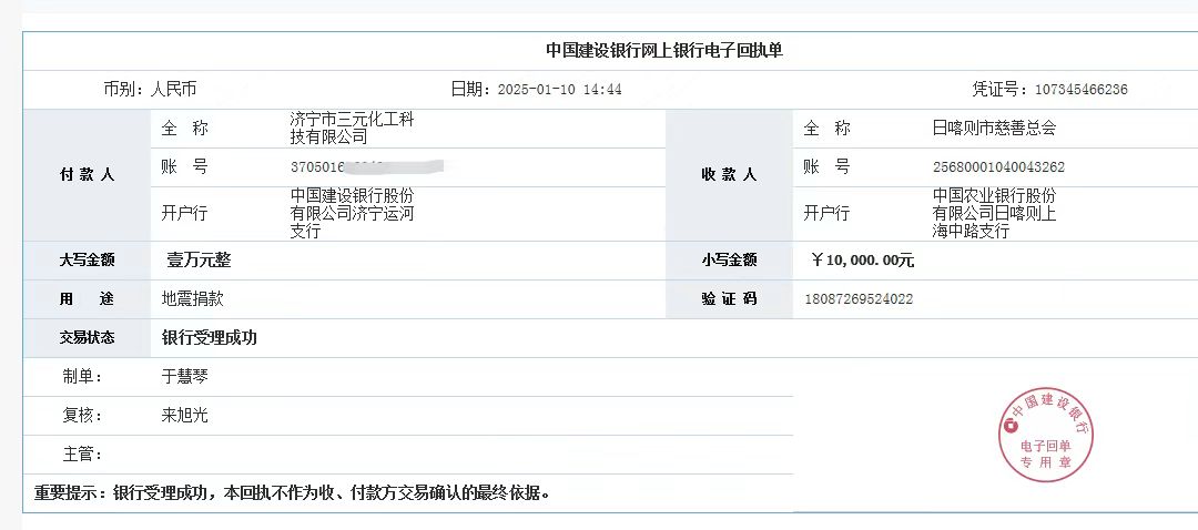 bat365在线中国官方网站向日喀则市慈善总会捐款壹万元支援地震救灾